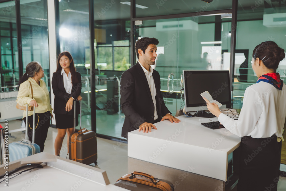 Obraz na płótnie Canvas - Business traveler checking in with passport while others wait in line at airport counter.