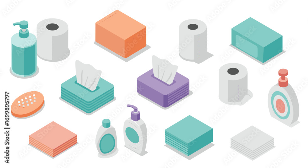Obraz na płótnie Canvas - Isometric bathroom essentials collection featuring soap dispensers and tissue boxes.