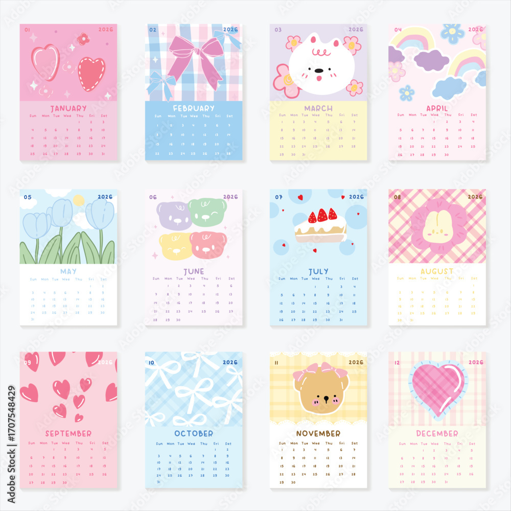 Obraz na płótnie Canvas - 2026 Monthly calendar 12 months template. Cute design layout calendar week starts on sunday with heart, ribbon, dog, bear, cake, flower on colorful background. Use for New year, business, print..