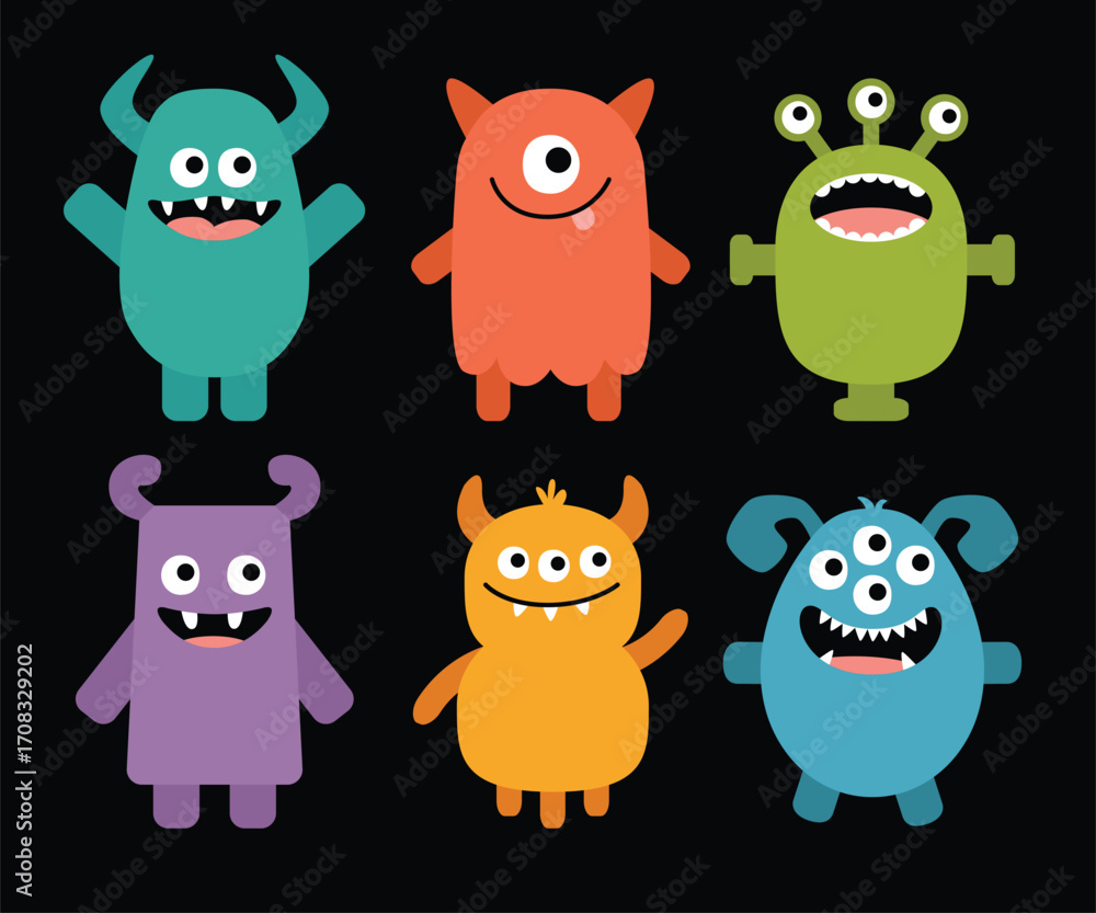 Obraz na płótnie Canvas - Cute monster icon set. Happy Halloween. Cartoon kawaii colorful scary funny character. Eyes, tongue, hands up. Baby collection. Sticker print. Childish style. Flat design. Black background. Vector.