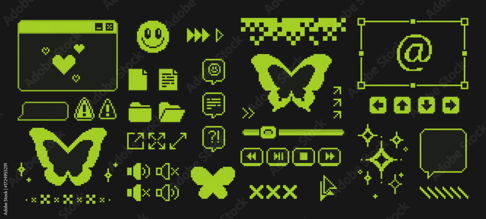 Obraz na płótnie Canvas - Pixel game interface with y2k aesthetic - browser window, butterfly icons, smiling face and media controls on black background. Neon green elements of navigation buttons for retro computer design..