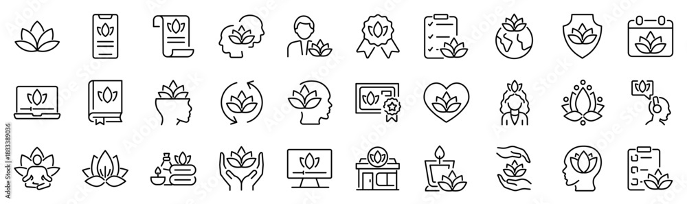 Obraz na płótnie Canvas - Set of 30 outline icons related to lotus. Linear icon collection. Editable stroke. Vector illustration.
