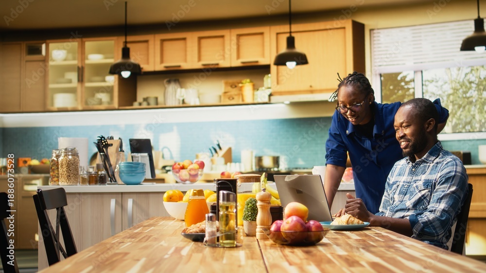 Obraz na płótnie Canvas - African American freelancer sitting at a kitchen table with a laptop, sending emails and explaining business tasks to his girlfriend. Couple enjoys a relaxed home lifestyle with coffee..