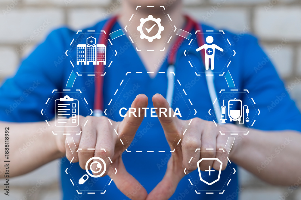 Obraz na płótnie Canvas - Doctor using virtual touch screen presses the word CRITERIA. Criteria Controlling Follow Guidelines Conduct Concept. Criteria evaluation. Goal setting and achievement strategy..