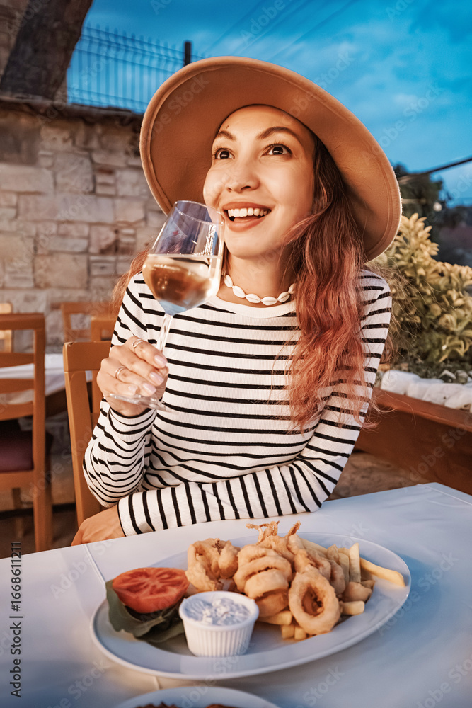 Obraz na płótnie Canvas - Young woman wearing a hat enjoying a glass of white wine and a plate of fried calamari with french fries in an outdoor restaurant.