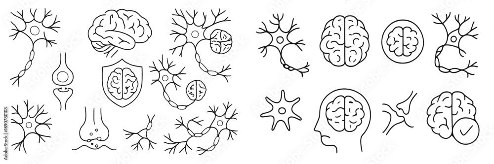 Obraz na płótnie Canvas - Neuron and brain line icon set for neurology and neuroscience concepts, including synapse, nerve cell, and central nervous system symbols.