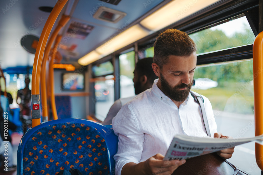 Obraz na płótnie Canvas - Man sitting in bus and reading newspapers, travelling to work..