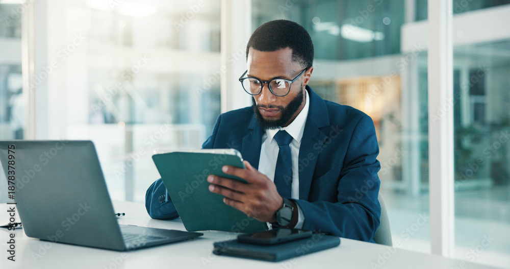 >Obrazy na płótnie Canvas>Wybrane motywy - zobacz więcej !>Tramwaj>Investor, tablet and black man in workplace, reading and website blog for economy news. African person, app and financial advisor with tech, internet and email notification for stock market exchange