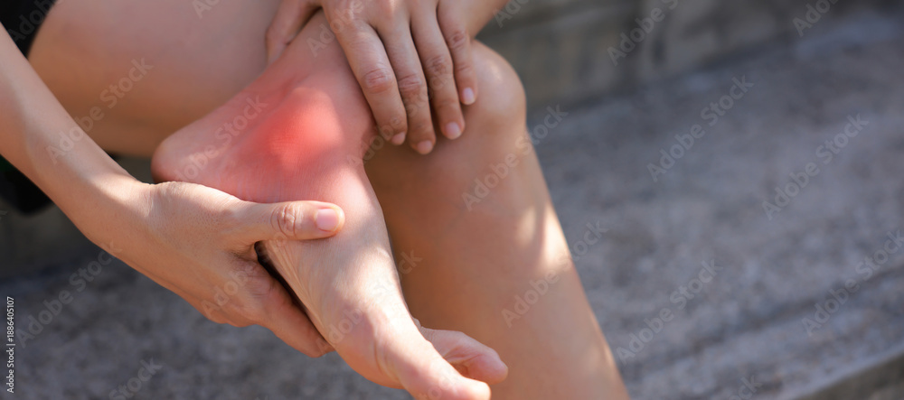 >Obrazy na płótnie Canvas>Wybrane motywy - zobacz więcej !>Tramwaj>Close-up of woman hand holding painful injured ankle with red inflamed spot and bruising. Medical concept of joint pain, sprain, ligament injury, bone ache, or arthritis in outdoor background.