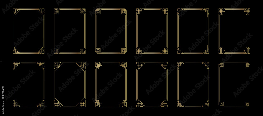 Obraz na płótnie Canvas - Gold geometric photo frame set. Golden glowing rectangle boarder and vintage elegant decorative elements for wedding invitations. Vector illustration isolated on black background.
