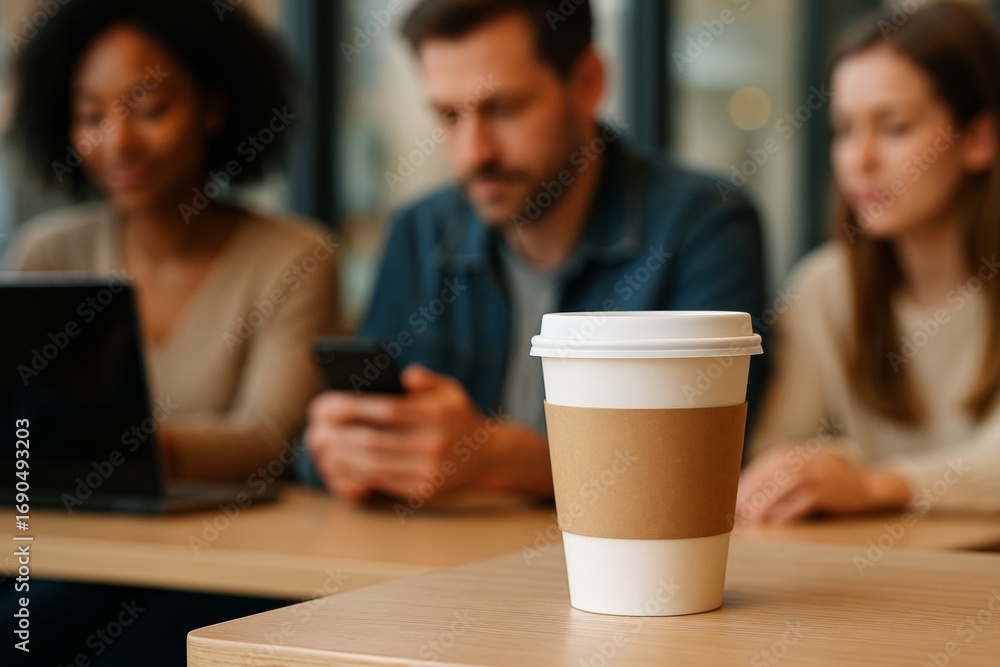 Obraz na płótnie Canvas - Blank coffee cup mockup with cardboard sleeve on table in focus, blurred people in background working in modern office or cafe setting. Ai generative.
