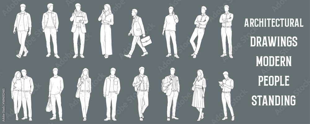 >Obrazy na płótnie Canvas>Wybrane motywy - zobacz więcej !>Tygrys>Architectural Drawings modern people standing in various casual and professional poses vector illustration, front view, human person Minimal style hand drawn. Sections, Elevations, Floor Plans