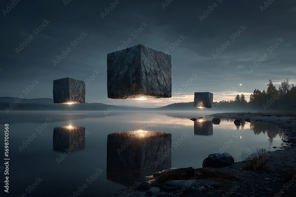 Obraz na płótnie Canvas - Floating cubes over water landscape surreal mysterious dark nature wallpaper background image for desktop.