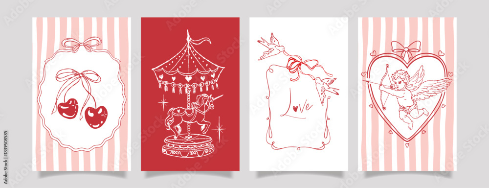 Obraz na płótnie Canvas - Romantic Valentine card set with hand-drawn sketch illustrations, cherries, carousel unicorn, doves, bows, heart frames, and cherub Cupid. Cute retro coquette style for , wedding, and holiday design.