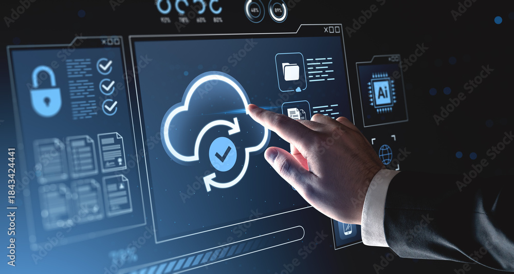 Obraz na płótnie Canvas - Hand interacting with holographic cloud computing interface on digital background showing cybersecurity and data synchronization concept..