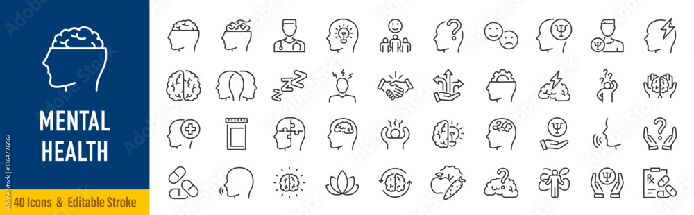 Obraz na płótnie Canvas - Mental health web icons in line style. Depression, psychotherapy, psychological, bipolar, negative thinking, obsession, collection. Editable stroke. Vector illustration..