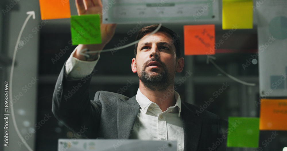 >Obrazy na płótnie Canvas>Wybrane motywy - zobacz więcej !>Tygrys>Glass wall, night or man in agency with sticky note, strategy or planning for report. Thinking, problem solving or employee in office with paper, idea board or brainstorming deadline on evening shift