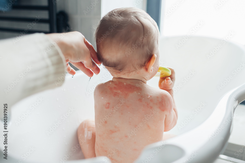 Obraz na płótnie Canvas - Close up of baby skin with atopic dermatitis. Mother bathing her daughter with eczema. Mom taking care of infant at home.