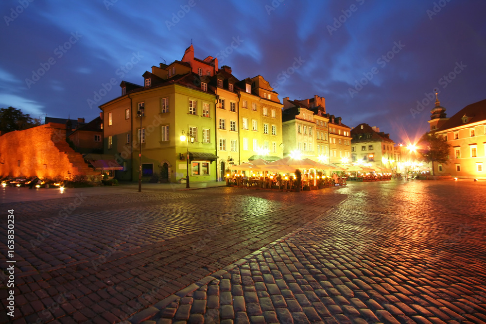 Obraz na płótnie Canvas - Night view of the old city in Warsaw with the Royal Palace and the blue sky.