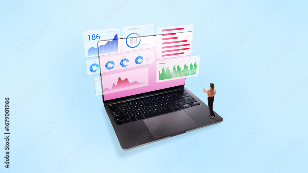 Obraz na płótnie Canvas - Modern collage. Woman standing by laptop with holographic business charts on blue background. Concept of data analysis, digital business, advertising strategy, editorial use, and mobile app design..