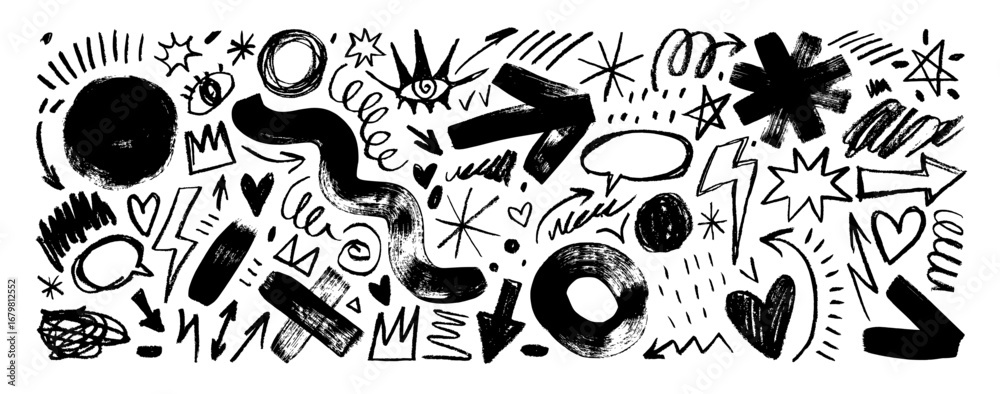 Obraz na płótnie Canvas - Punk and rock style crayon drawn shapes and doodles. Bold brush drawn wave, arrow, circle and cross. Graffiti doodle tattoo shapes. Funky crayon punk stickers. Graphic illustration..