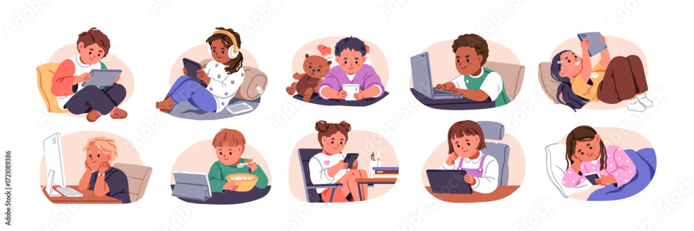 >Obrazy na płótnie Canvas>Wybrane motywy - zobacz więcej !>Warszawa>Kids with mobile phones, laptops, tablets and computers. Children and digital gadgets addiction. Smartphone screen addicted boys and girls. Flat vector illustrations isolated on white background