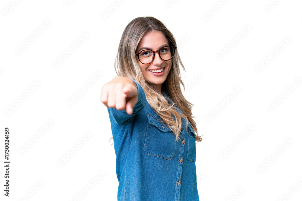 Obraz na płótnie Canvas - Young Uruguayan woman over isolated background pointing front with happy expression.