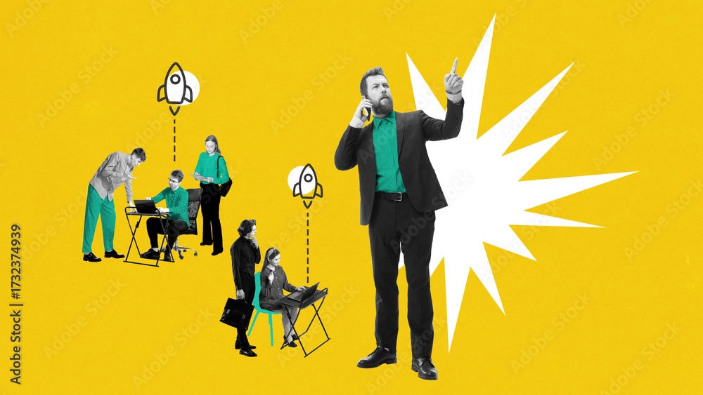 Obraz na płótnie Canvas - Creative collage. Confident businessman leading startup team with rocket icons on yellow background. Concept of corporate leadership, business growth, motivation, digital marketing, teamwork success..