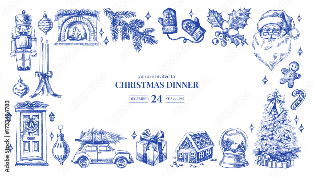 Obraz na płótnie Canvas - Christmas invitation card with hand drawn holiday elements. Festive mood, elegant vintage style frame design. Vector sketch illustration..