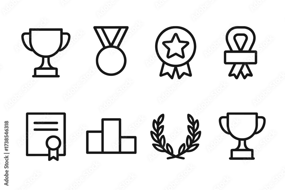 Obraz na płótnie Canvas - Ace Achievement Icons. Outline icon set of ace achievements: trophy, medal, star badge, ribbon, certificate, podium, laurel wreath, champion cup. Line icons in.