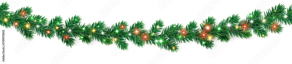 Obraz na płótnie Canvas - Seamless colorful Christmas garland of fir branches with red, green, and yellow lights. Perfect glowing border for Christmas tree decorations. Transparent background in vector file..