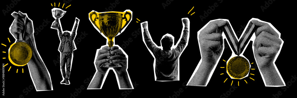 Obraz na płótnie Canvas - Business success celebration with people holding trophies and medals in bold halftone collage style.