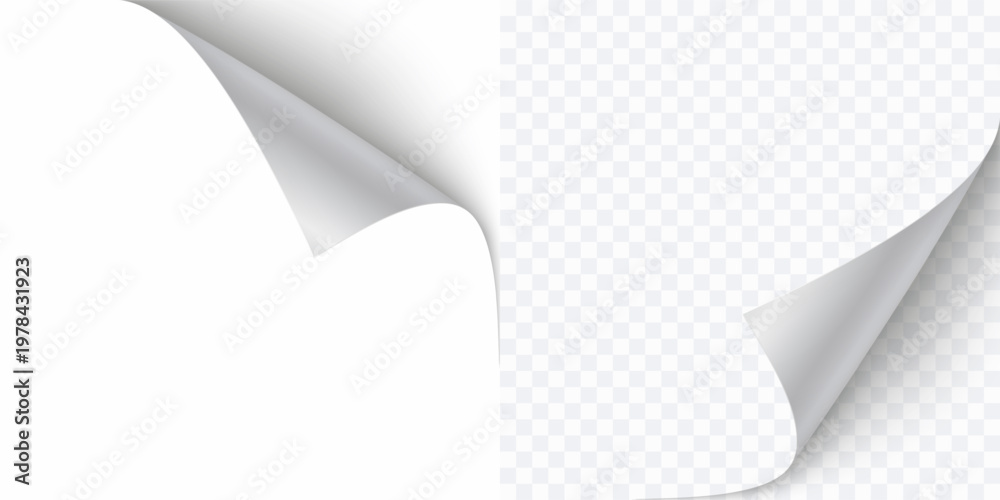 Obraz na płótnie Canvas - Curled page corner isolated on transparent and white background. Blank curve paper edge, bent sheet, note angle with realistic shadow. Vector rolled up stickers, peel banners.
