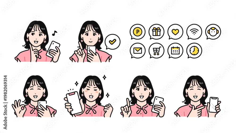 Obraz na płótnie Canvas - スマートフォンを操作するポジティブな半袖の若い女性と通知アイコンセット.