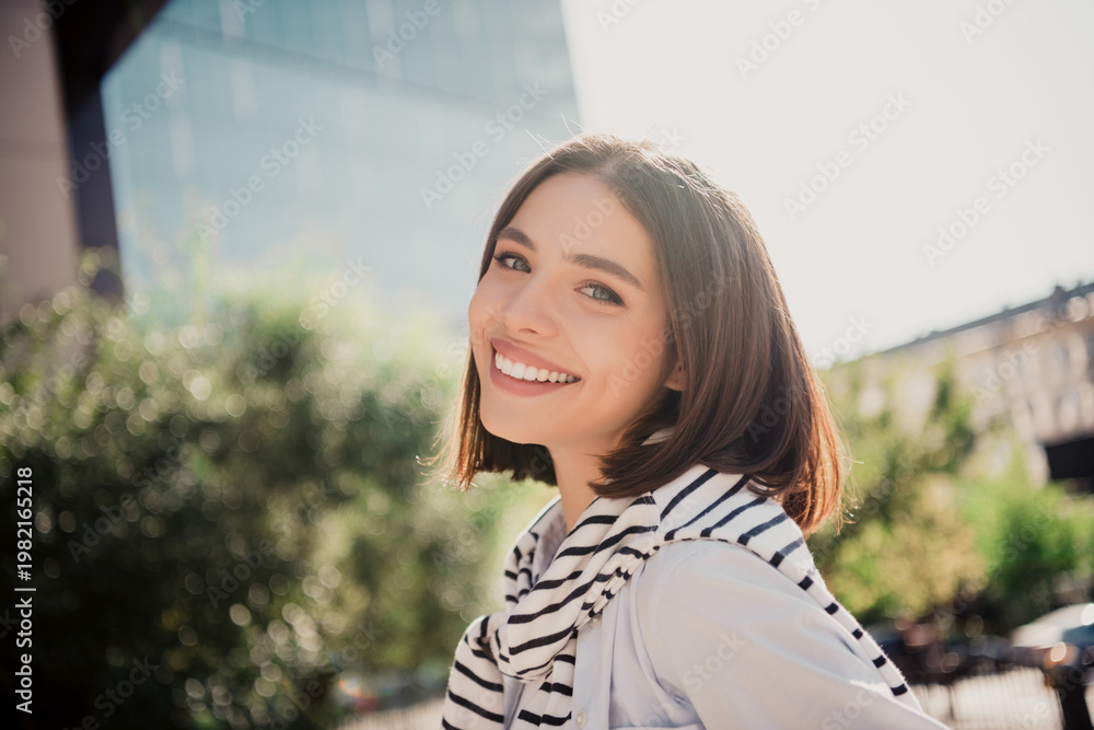 Obraz na płótnie Canvas - Smiling young woman portrait outdoors in city enjoying a sunny day, casual style with striped scarf and a confident relaxed expression.
