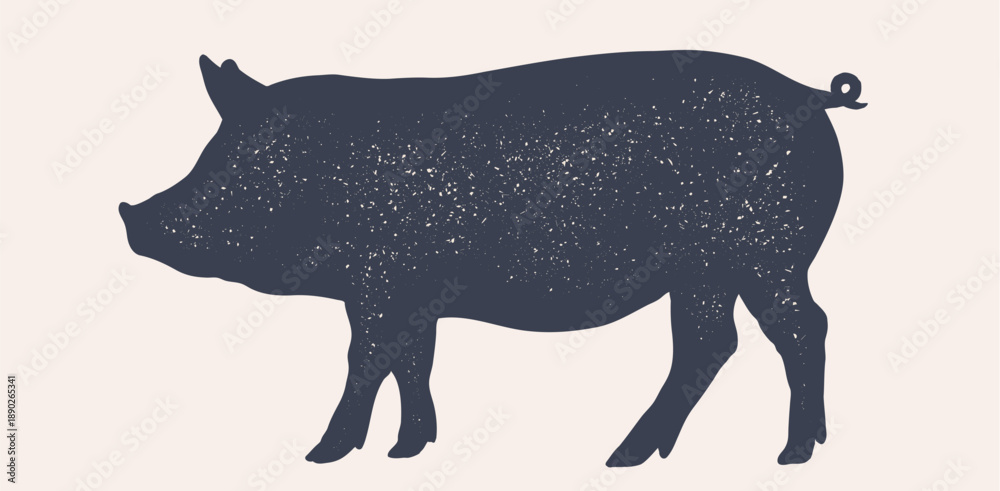 Obraz na płótnie Canvas - Pork, pig, hog, meat sketch, hand drawn. Vintage print, drawing pig hog silhouette, sketch ink pencil style drawing. Butchery pork pig silhouette, animal, meat shop. Vector Illustration.