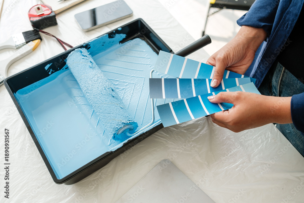 >Obrazy na płótnie Canvas>Wybrane motywy - zobacz więcej !>Wieś>A person holds a fan of paint swatches next to a blue roller in a tray, preparing for a home makeover. The image conveys planning, creativity, and color selection in a stylish interior project.