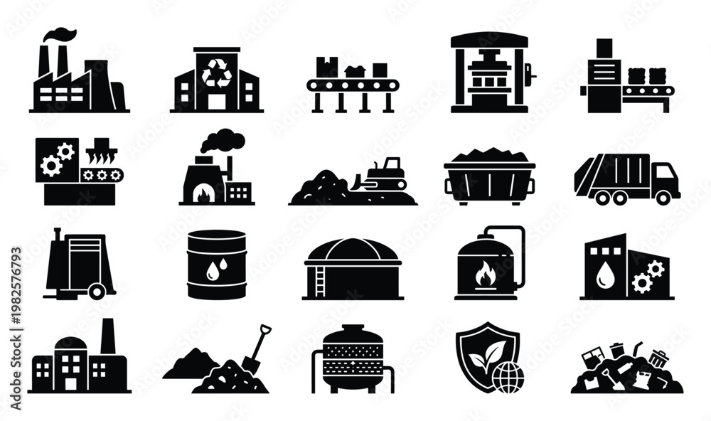 Obraz na płótnie Canvas - Industrial process and waste management icon collection illustrating manufacturing, recycling, energy production, and environmental protection concepts for various business and educational.