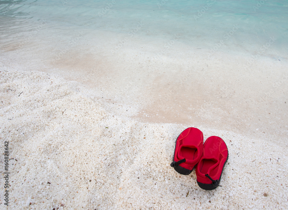 Obraz na płótnie Canvas - Pair of swimming shoes on sea coast.