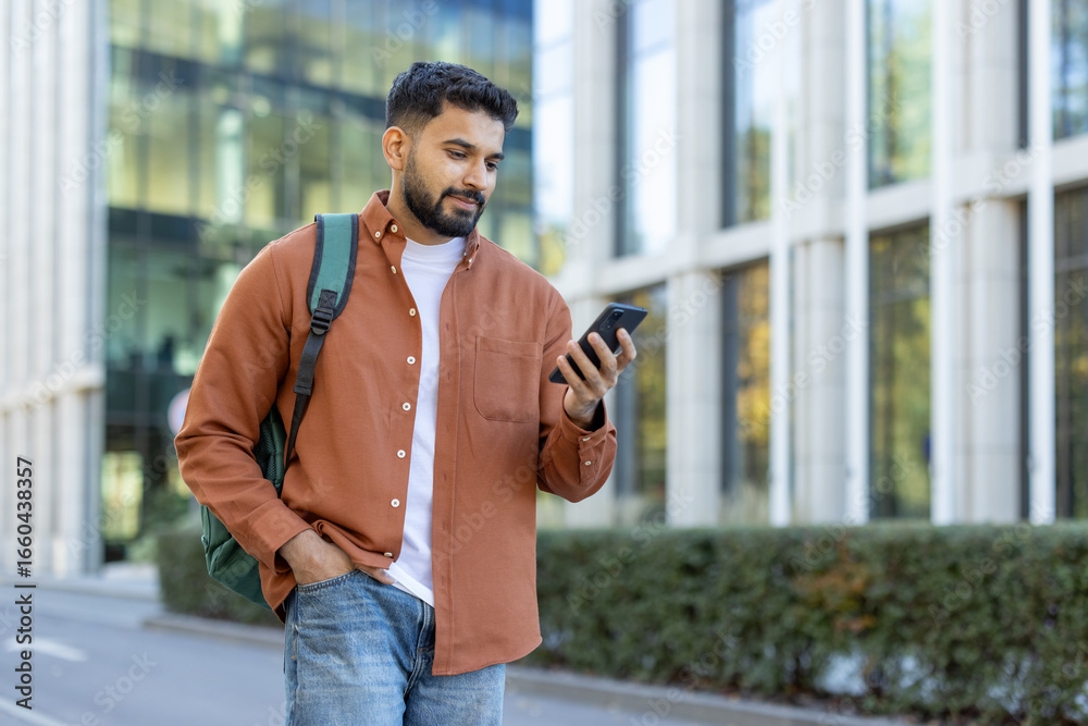 Obraz na płótnie Canvas - Young man using smartphone on a city street close to modern buildings.