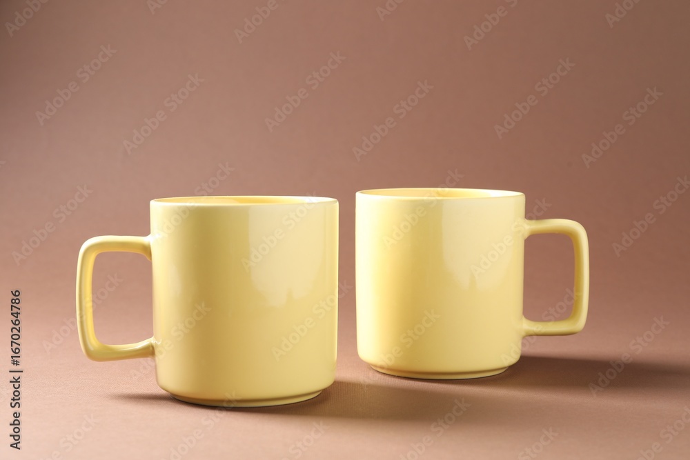 Obraz na płótnie Canvas - Promotion. Two yellow mugs on brown background.