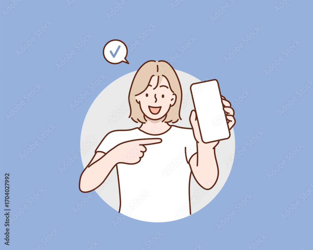 Obraz na płótnie Canvas - Young Woman Holding Smartphone with Check Mark, Mobile App Approval Concept, Hand drawn style vector design illustrations..