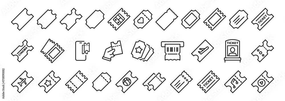 Obraz na płótnie Canvas - Tickets outline icon set. Cinema, concert, flight, event, sports line icons. Vector icons.