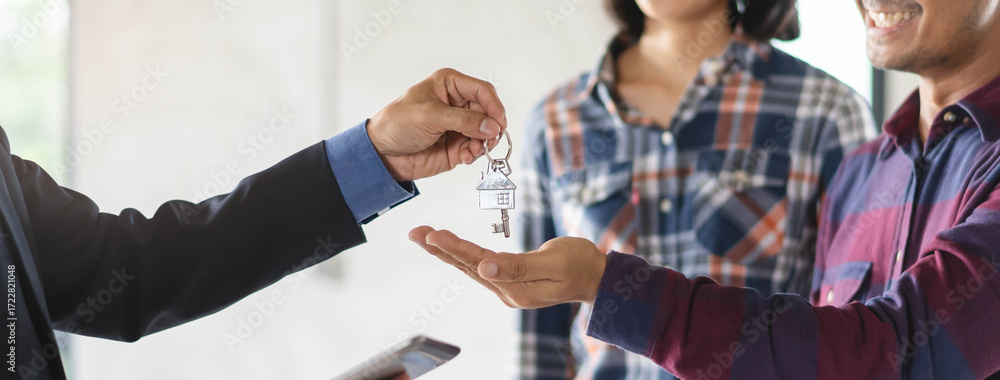 Obraz na płótnie Canvas - close up view hand of property realtor landlord giving key house to buyer tenant. banner wide side..
