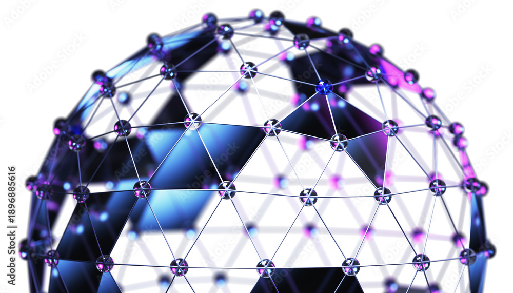 Obraz na płótnie Canvas - Abstract neon glass blue and purple wireframe 3d sphere of dots and lines on black background. Futuristic geometric bg with hologram circular polygon mesh, grid ball, global network.