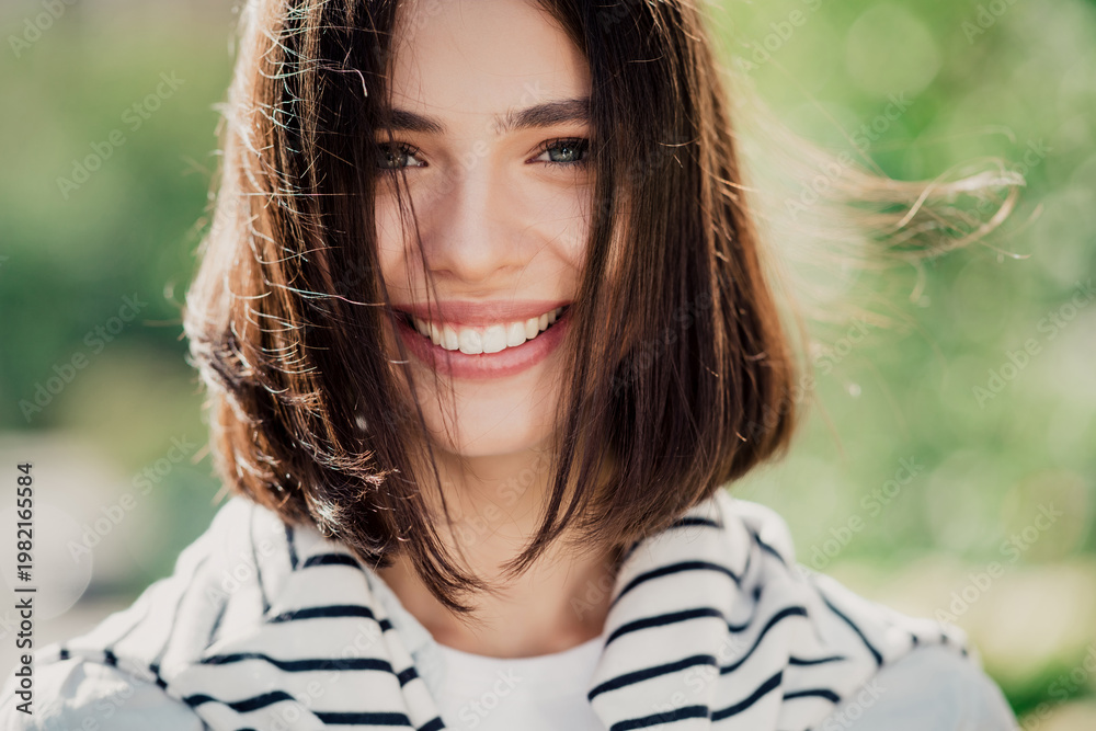 >Obrazy na płótnie Canvas>Wybrane motywy - zobacz więcej !>Woda>Smiling young woman portrait outdoors in natural light with short brown hair and striped sweater, happy casual lifestyle close-up showing bright smile and fresh spring atmosphere