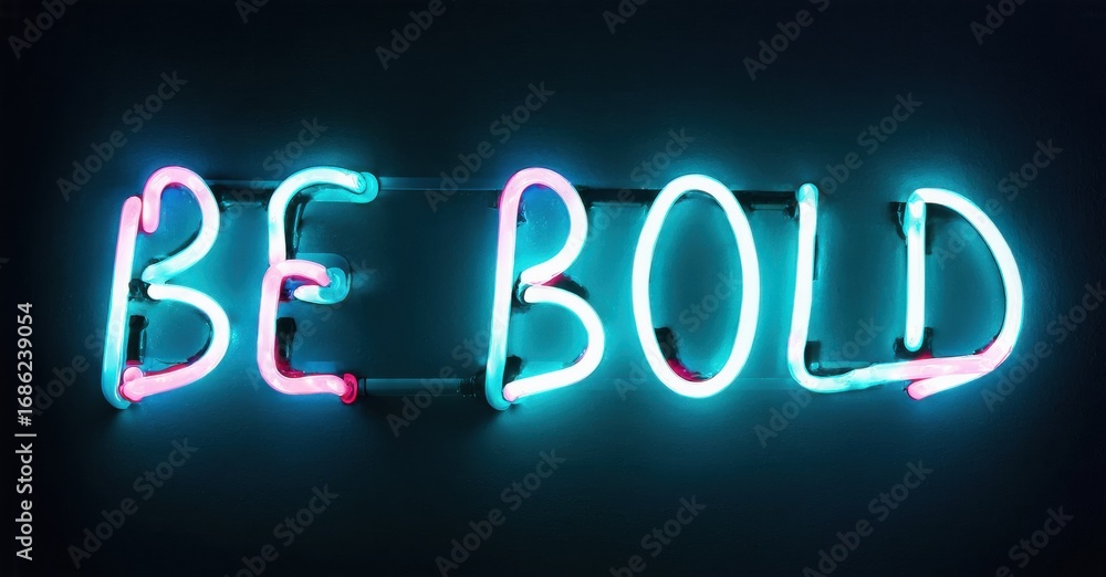 Obraz na płótnie Canvas - Bright neon sign displays text BE BOLD. Turquoise, pink hues illuminate dark background. Inspiring message, simple design..