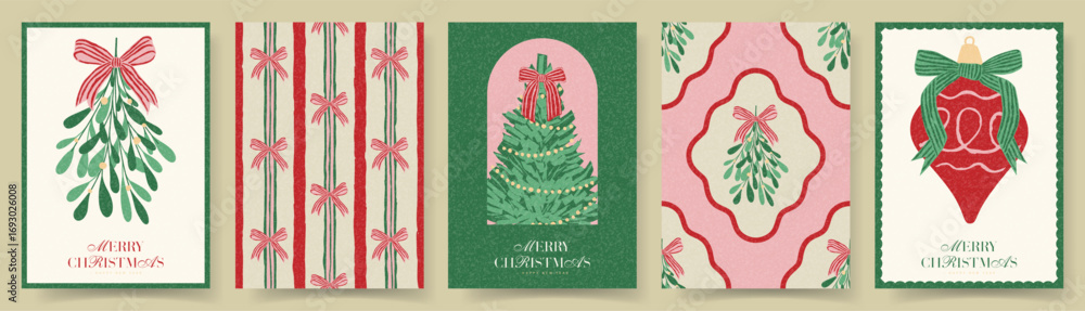 Obraz na płótnie Canvas - Trendy Christmas and New Year cards. Retro Christmas posters with bows, ball, fir-tree, mistletoe and typography design. Contemporary minimalist New Year flyers for branding, cover, social media.