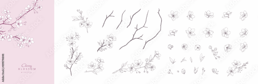 Obraz na płótnie Canvas - Set of cherry blossoms flowers and brunch. Spring Detailed background with botanic floral elements for Valentines day invitation, wallpaper art or save the date card.