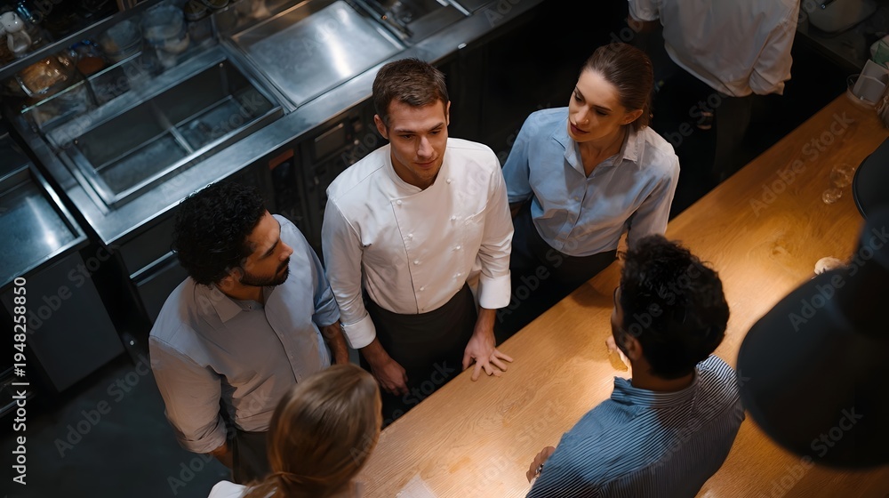 Obraz na płótnie Canvas - Restaurant team in professional meeting around a bar counter high angle view.
